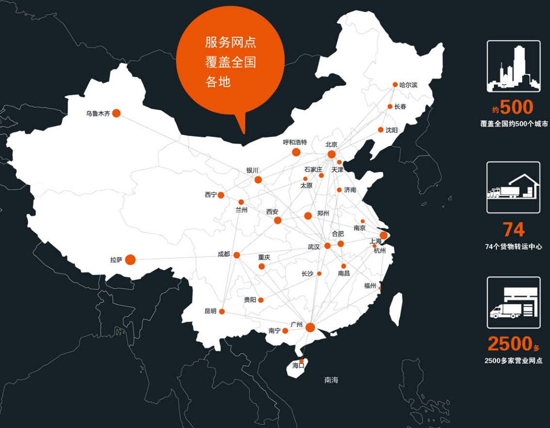 擁有74個(gè)貨物轉(zhuǎn)運(yùn)中心、2500多家營(yíng)業(yè)網(wǎng)點(diǎn)、自由運(yùn)營(yíng)車輛近3000臺(tái)。